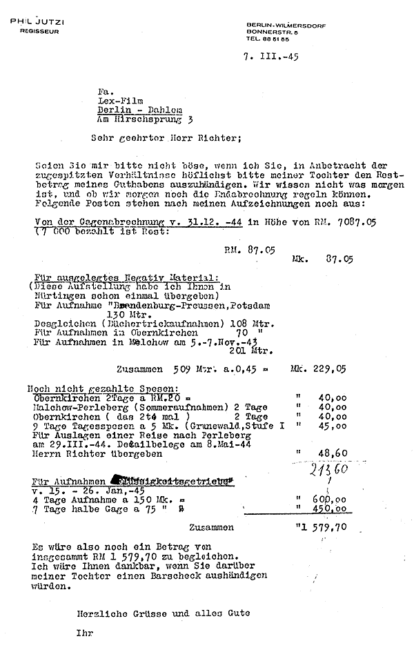 FilmMaterialien 5 - Phil Jutzi Abrechnung mit Firma Lex-Film aus dem Phil Jutzi-Nachlaß im Archiv der Stiftung Deutsche Kinemathek, Berlin Biografie - Zurück zum Inhalt von Heft 5 - Andere Hefte der Reihe.